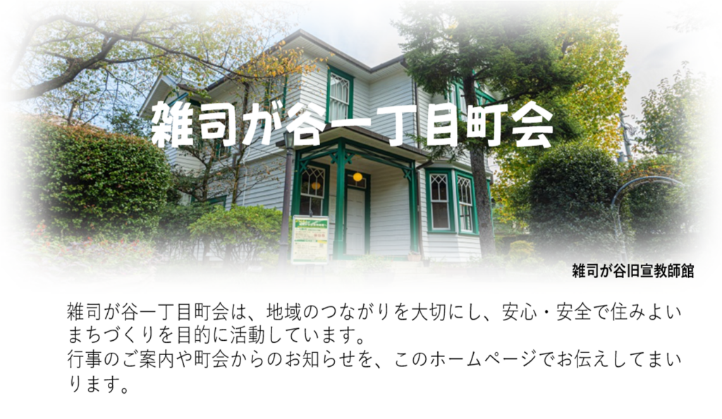 雑司が谷一丁目町会のホームページをご覧いただき、ありがとうございます。当町会は、地域にお住まいの皆さま相互の親睦を深め、安心・安全で住みよいまちづくりを目的として、さまざまな活動を行っております。